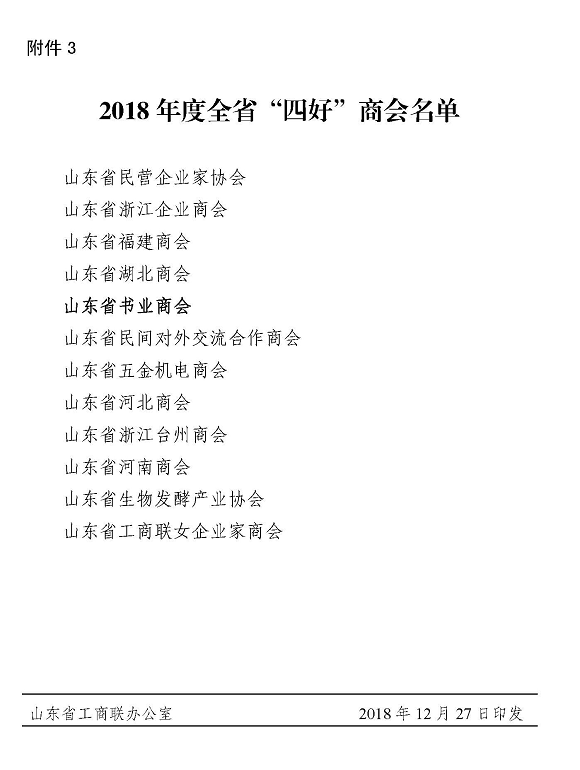 最近,山东省工商业联合会下发文件《关于表彰2018年度山东省工商联系统先进单位的决定》(鲁联发[2018]88号),山东省书业商会被认定为“2018年度全省‘四好’商会”