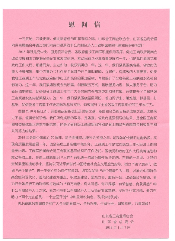 王主席还代表省工商联向商会送来了慰问信和“如意”礼品,祝商会和张泉会长在新的一年里顺心顺意、万事如意!勉励商会进一步树立有为有位的意识,以推进商会组织现代化、规范化建设为重点,以政治建会、团结立会、服务兴会、改革强会为统领,在助力“两个走在前列、一个全面开创”中彰显组织特色、发挥独特优势。