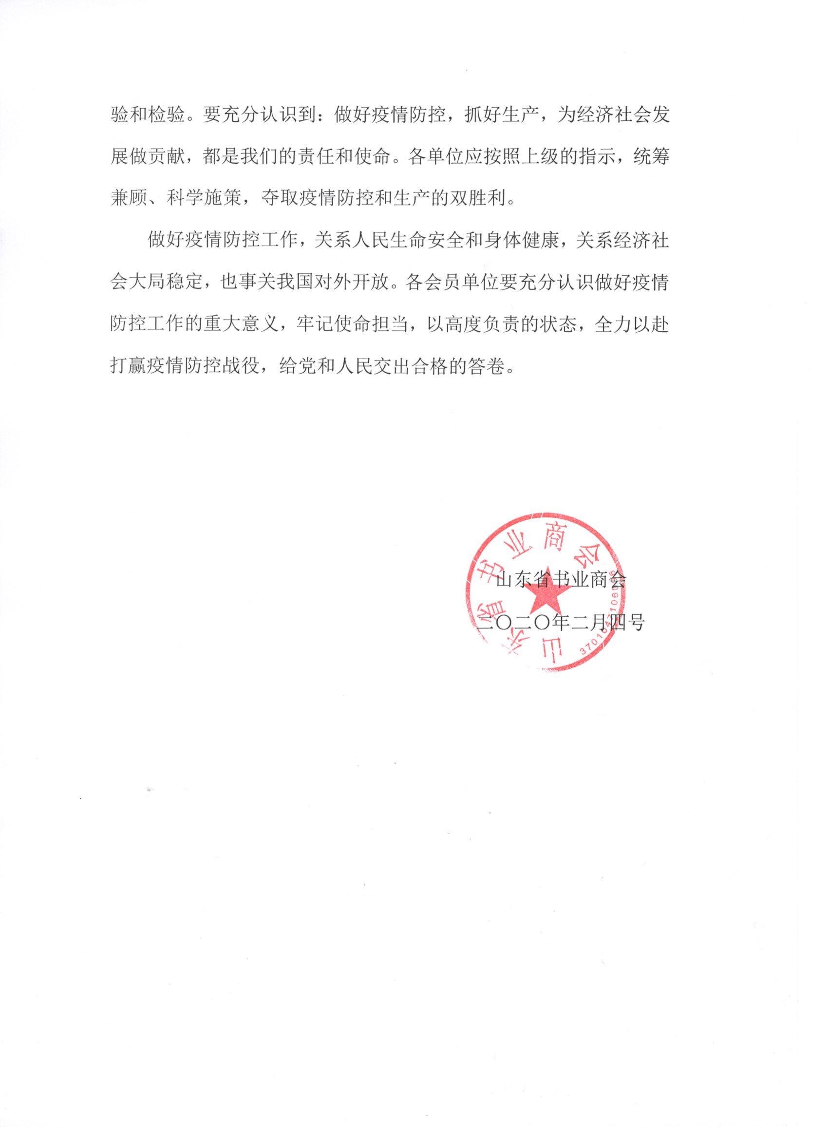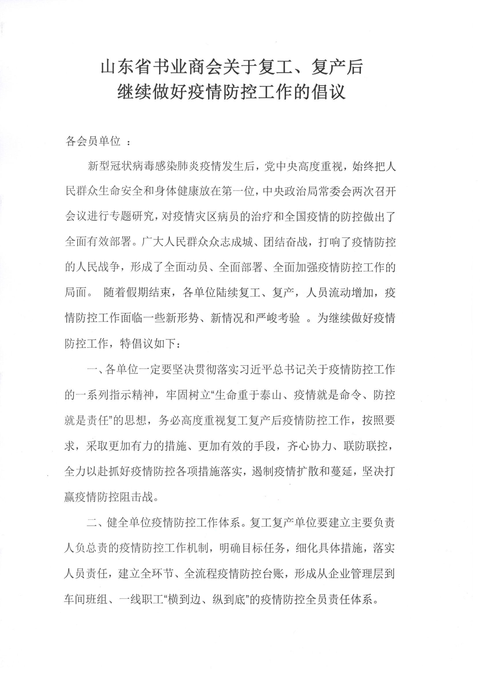 山东省书业商会关于复工、复产后继续做好疫情防控工作的倡议