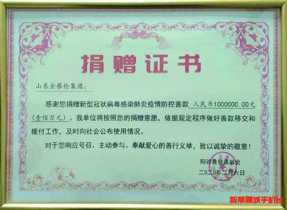 在当前全国新型冠状病毒疫情严峻的形势面前,在陈立仁常务副会长的带领下,山东金蔡伦集团认真贯彻落实市、县关于防控新型冠状病毒感染肺炎工作的有关通知精神和工作要求,采取多种举措严控疫情传入生产岗位,全力以赴确保广大干部职工的生命安全和身体健康。2月6日,山东金蔡伦集团向阳谷县慈善总会捐款100万元,用于新型冠状病毒肺炎的疫情防控。