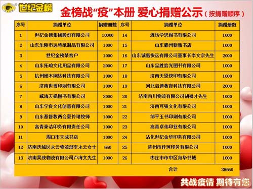 疫情期间,中央部署:山东省对口支援黄冈。作为山东省书业商会会长单位,世纪金榜不仅自己慷慨解囊,还主动号召广大会员单位奉献爱心。与会员单位联合订制了“情牵湖北 爱心汇聚”——战“疫”本册。