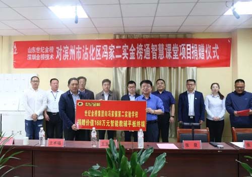 5月19日,捐赠仪式在滨州市沾化区冯家镇举行。沾化区副区长宋光义、沾化区政协副主席、沾化一中副校长郭庆学、沾化区工商联副主席赵文军、沾化区教体局局长丁明新、山东省书业商会会长、世纪金榜集团董事长张泉等出席捐赠仪式。捐赠仪式由沾化区冯家镇镇长王平主持。