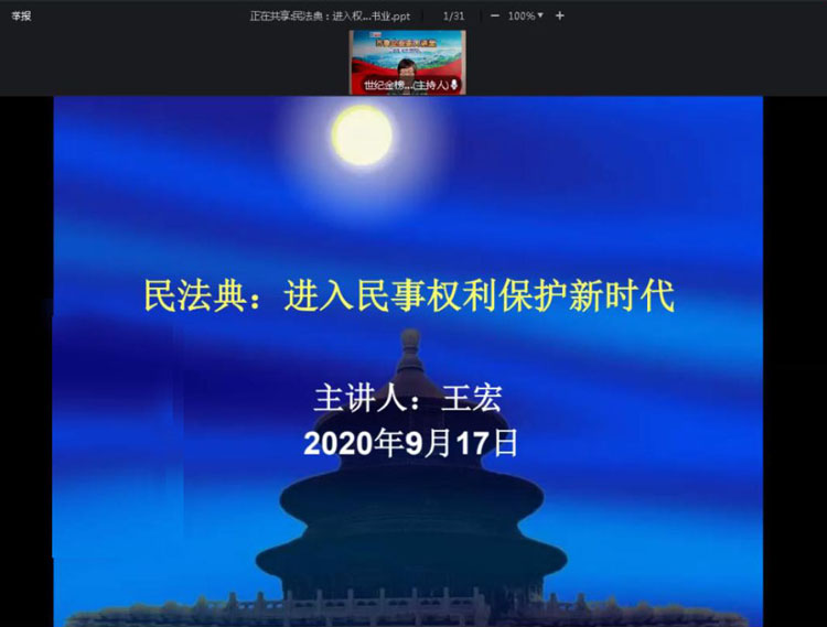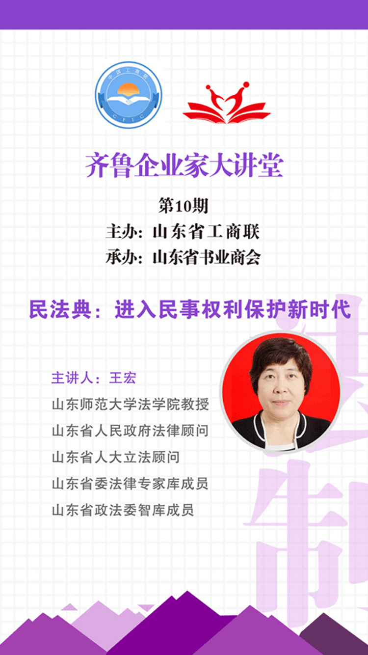 为帮助民营企业深入了解《中华人民共和国民法典》,争取平等发展权力,推动民营企业健康、快速发展。2020年9月17日上午,由山东省工商联主办、山东省书业商会承办的第10期《齐鲁企业家大讲堂》在世纪金榜集团演播室进行。特邀请业界知名专家、山东师范大学法学院王宏教授为大家讲授主题为《民法典——进入民事权利保护新时代》的线上专题培训。张泉会长因陪同全国工商联李兆前主席调研,特安排张彦民秘书长组织和主持会议。