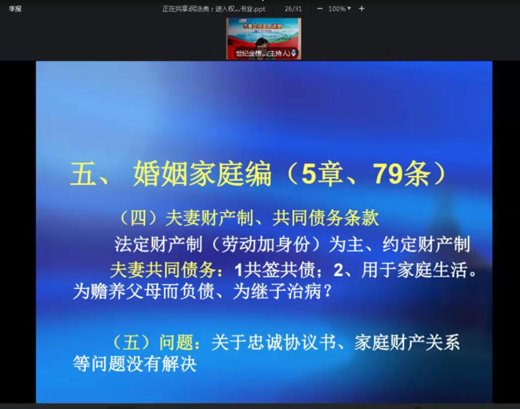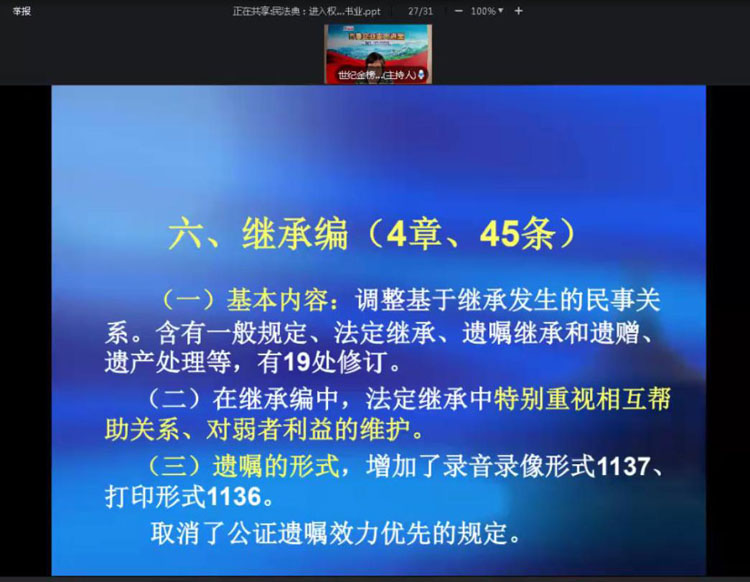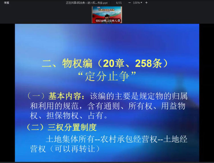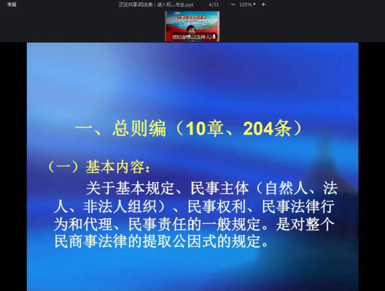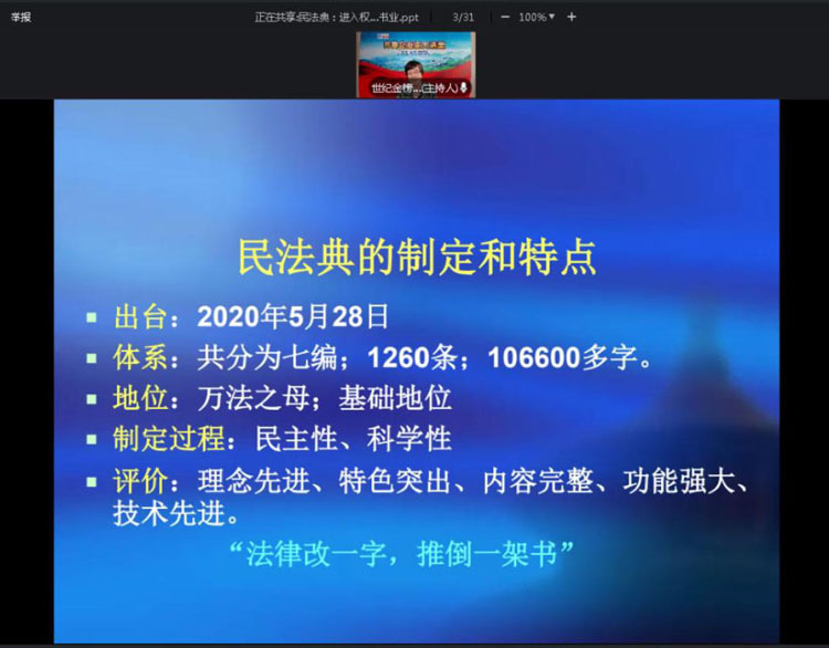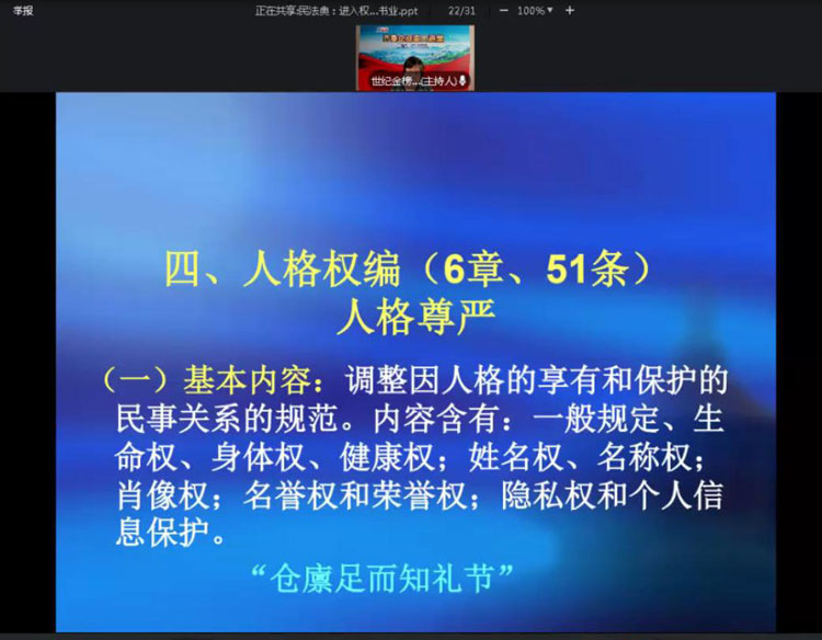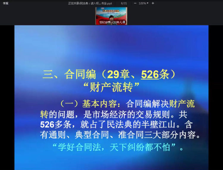 培训中,王教授为大家讲述了《民法典》的立法精神和核心要义;结合有关案例,深入浅出地向大家阐述《民法典》中的总则编、物权编、合同编、人格权编、婚姻家庭编、继承编、侵权责任编等。