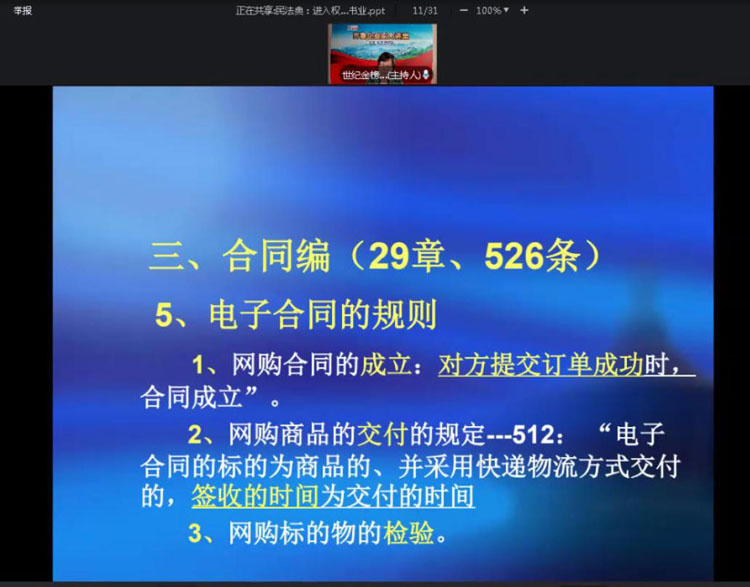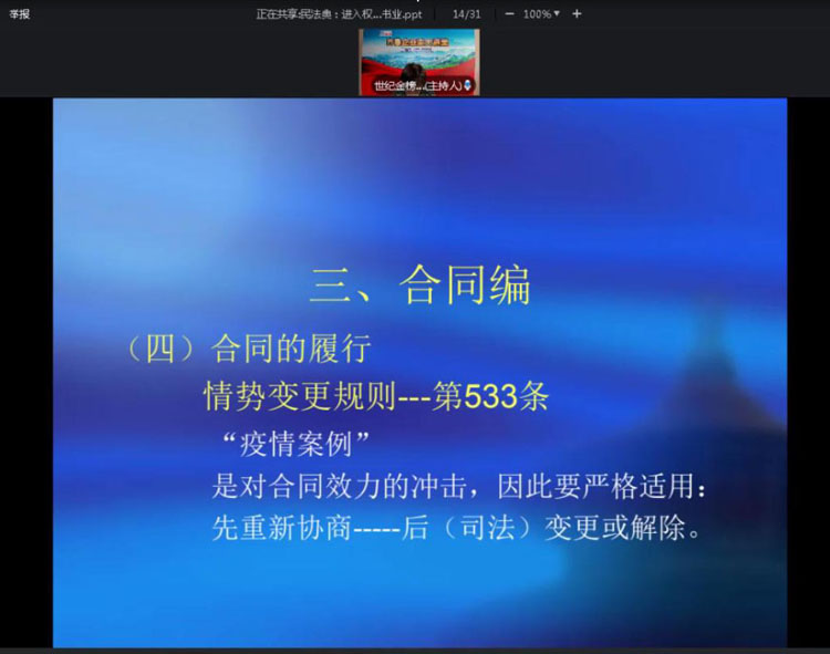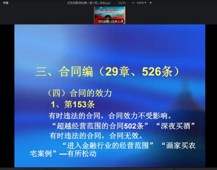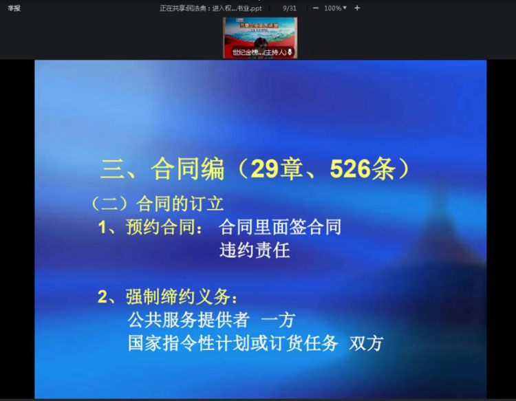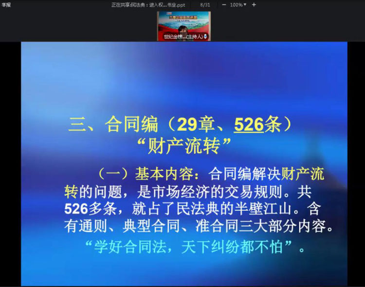 结合商会特点,王教授重点讲解合同编内容。从合同的订立、合同的效力、合同的履行、合同的解除、保证合同、保理合同、物业服务合同、合伙合同等类型进行阐述。多方位多角度以理论、实例相结合的方式将合同编做了通俗易懂的解读。