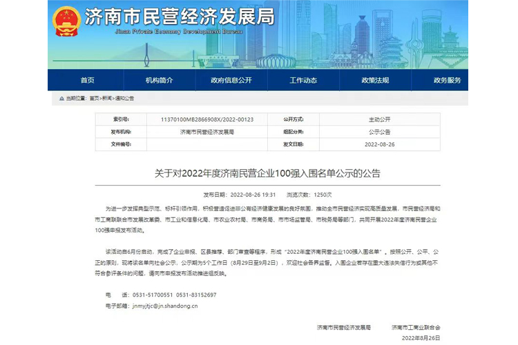 为进一步发挥典型示范、标杆引领作用,积极营造促进非公有经济健康发展的良好氛围,推动全市民营经济实现高质量发展,市民营经济局和市工商联联合市发展改革委、市工业和信息化局、市农业农村局、市商务局、市市场监管局、市税务局等部门,共同开展2022年度济南民营企业100强申报发布活动。