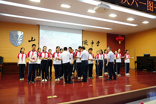 随后,大家移步六楼礼堂,举行捐赠仪式。主持人热情洋溢地介绍了参会领导,现场的师生们对各位嘉宾的到来表示热烈欢迎。济微中学副校长李兴华上台致欢迎辞,向参与活动的各界爱心单位与人士致以衷心感谢,并寄语同学们珍惜阅读机会,在书籍中汲取智慧与力量。10名学生代表满怀欣喜地走上台,从领导嘉宾手中接过一本本崭新图书。此刻,传递的不仅是图书,更是社会各界对孩子们的关爱与期望,现场气氛温馨感人。