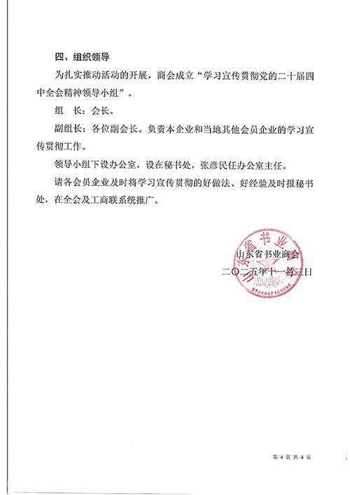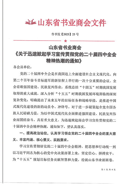 山东省书业商会《关于迅速掀起学习宣传贯彻党的二十届四中全会精神热潮的通知》
