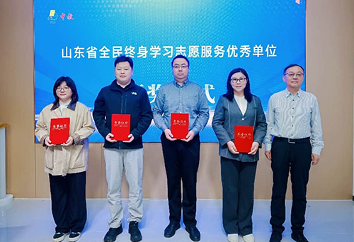 山东省成人教育协会常务副会长谢明浩代表山东省全民终身学习活动组委会向山东大学图书馆、中国海洋大学图书馆、山东师范大学图书馆、山东中教产业发展股份有限公司颁发了山东省全民终身学习志愿服务优秀单位证书,表彰以上四家单位为山东省全民智学中心平台建设所做的贡献。